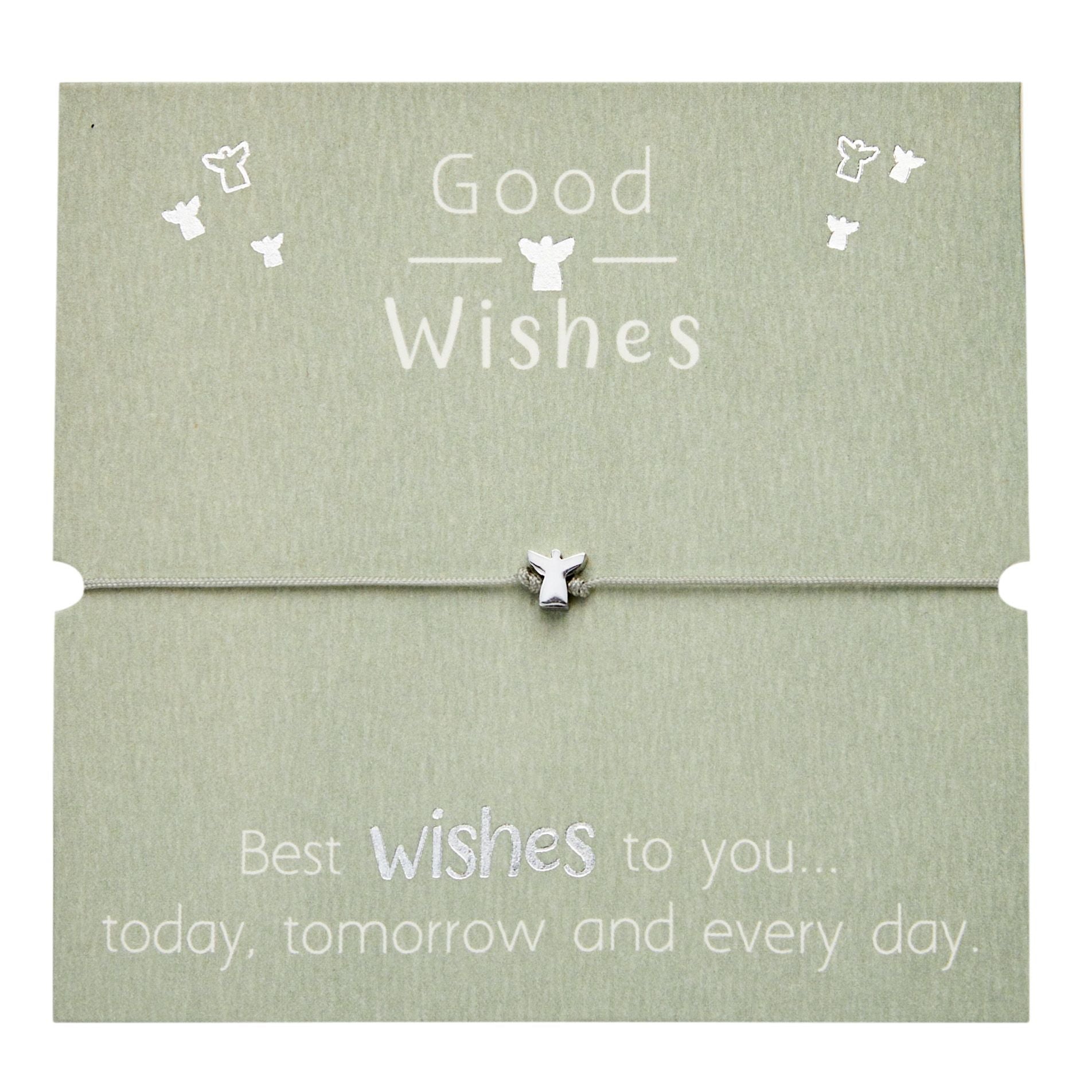 Gustowna, prosta bransoletka z materiału z symbolem anioła. Rozmiar bransoletki można regulować, pociągając za końce.