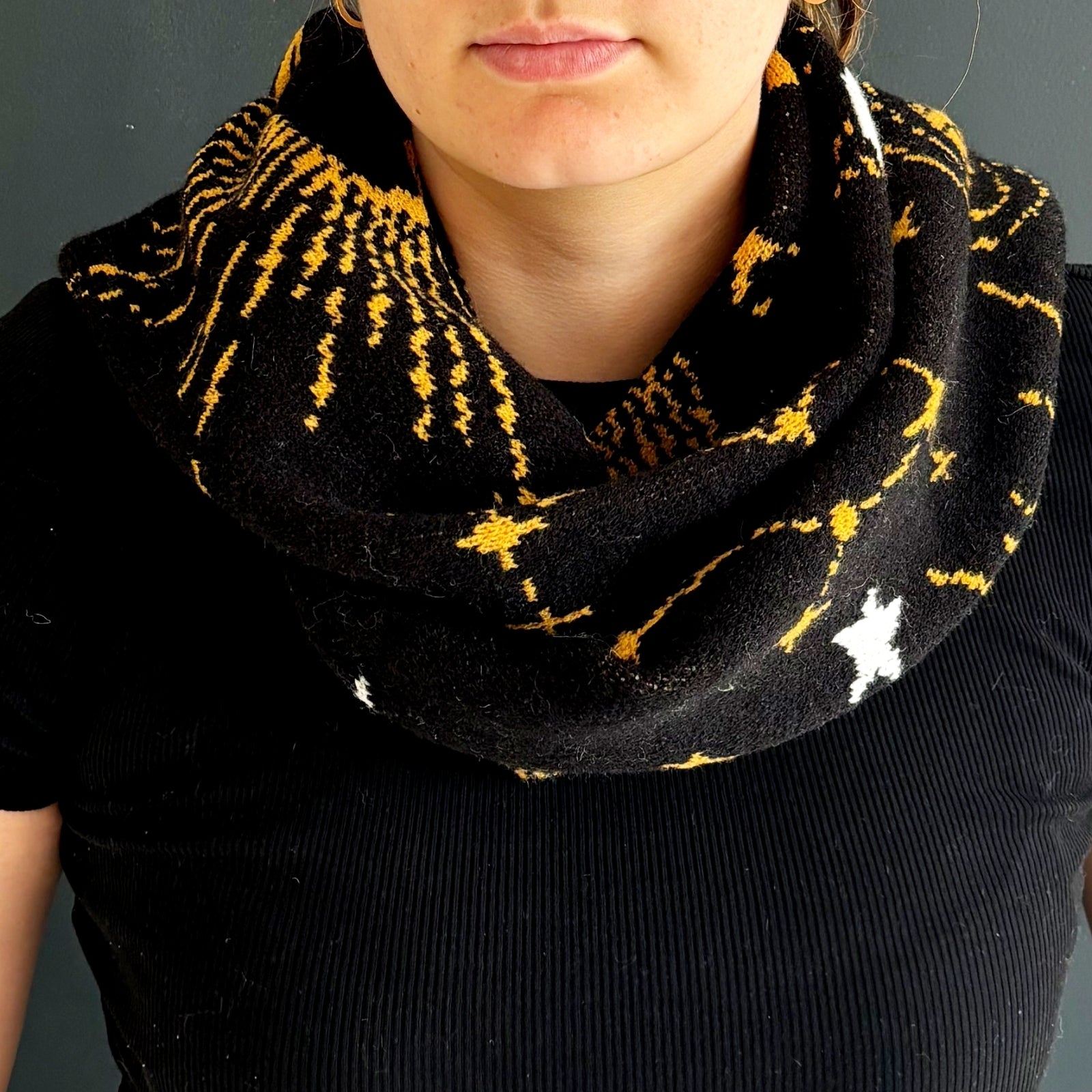 Trakteer jezelf op een vleugje kosmische elegantie met deze prachtige sjaal. Versierd met een prachtig patroon van sterren en planeten is deze sjaal magisch op kille winterdagen wanneer de wind opsteekt en de vorst bijt. Met een donker kleurenpalet dat doet denken aan de nachtelijke hemel, schittert deze sjaal met fonkelende sterrenbeelden en vallende sterren in helder garen van goud en geel. Hij is superzacht en houdt je nek gegarandeerd warm tijdens de koudere maanden. Koop er een voor jezelf of geef hem cadeau aan een vriend die van sterrenkijken houdt.