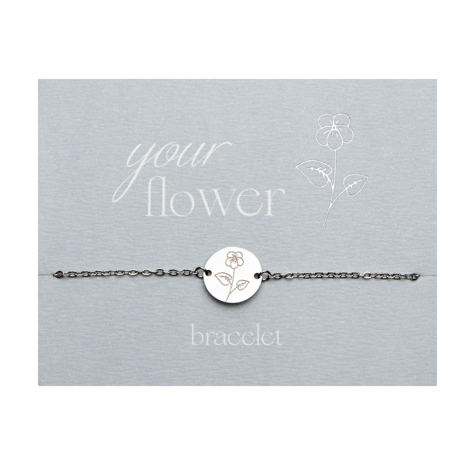 De collectie Your Flower bestaat uit kettingen en armbanden, elk gegraveerd met een geboortebloem. Alle sieraden zijn gemaakt van roestvrij staal en 6 geboortebloemen zijn ook verguld. De armbanden zijn aan beide zijden gegraveerd met de geboortebloem.
