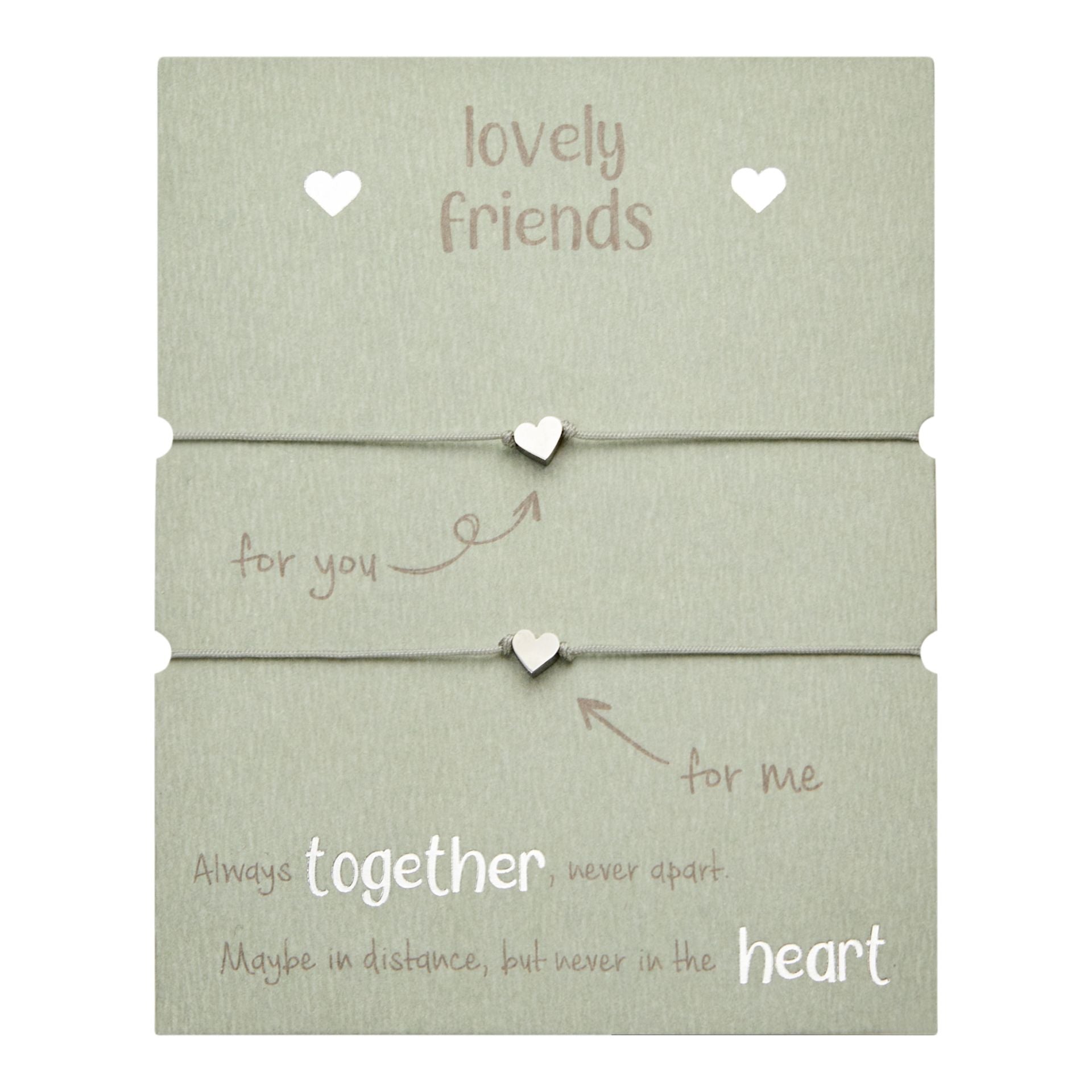 Mooie set van twee eenvoudige armbanden van textiel met het symbool van een hart, om te delen of om zelf te houden. De armband kan in maat worden versteld door aan de uiteinden te trekken.