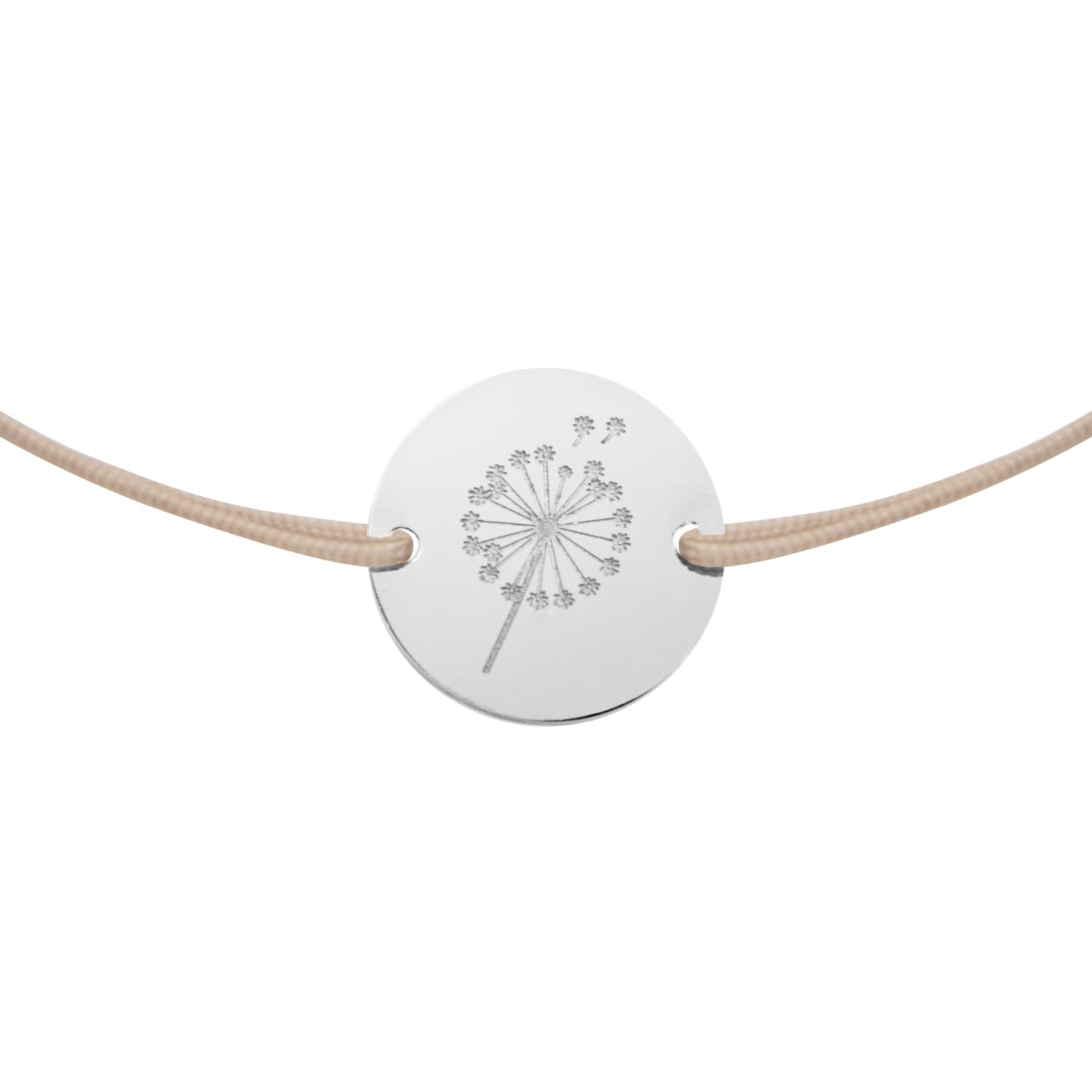 Smaakvolle, eenvoudige textielarmband met paardenbloemmotief. De armband kan in maat worden versteld door aan de uiteinden te trekken.