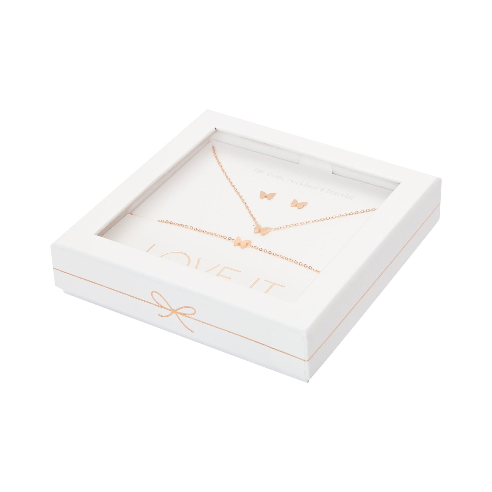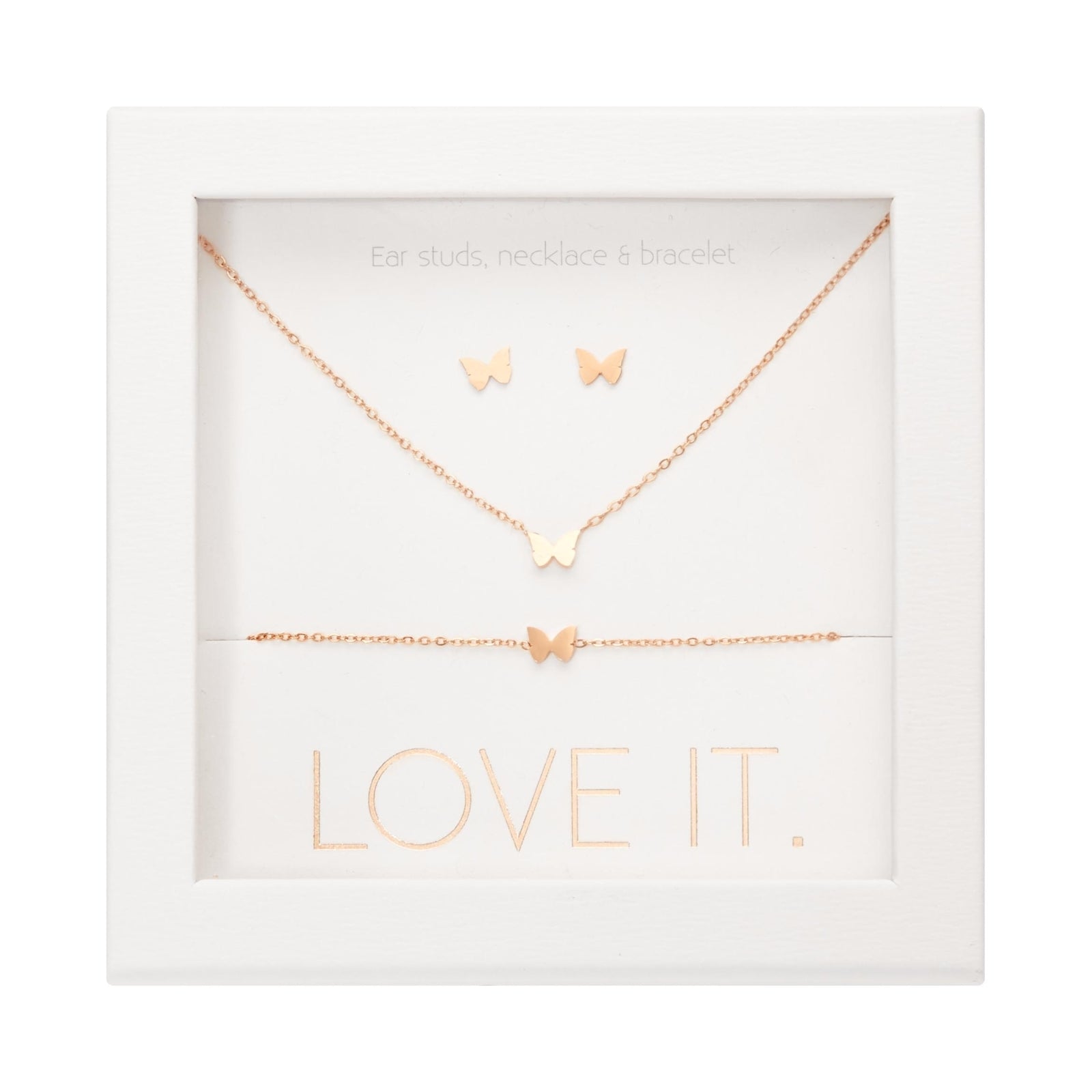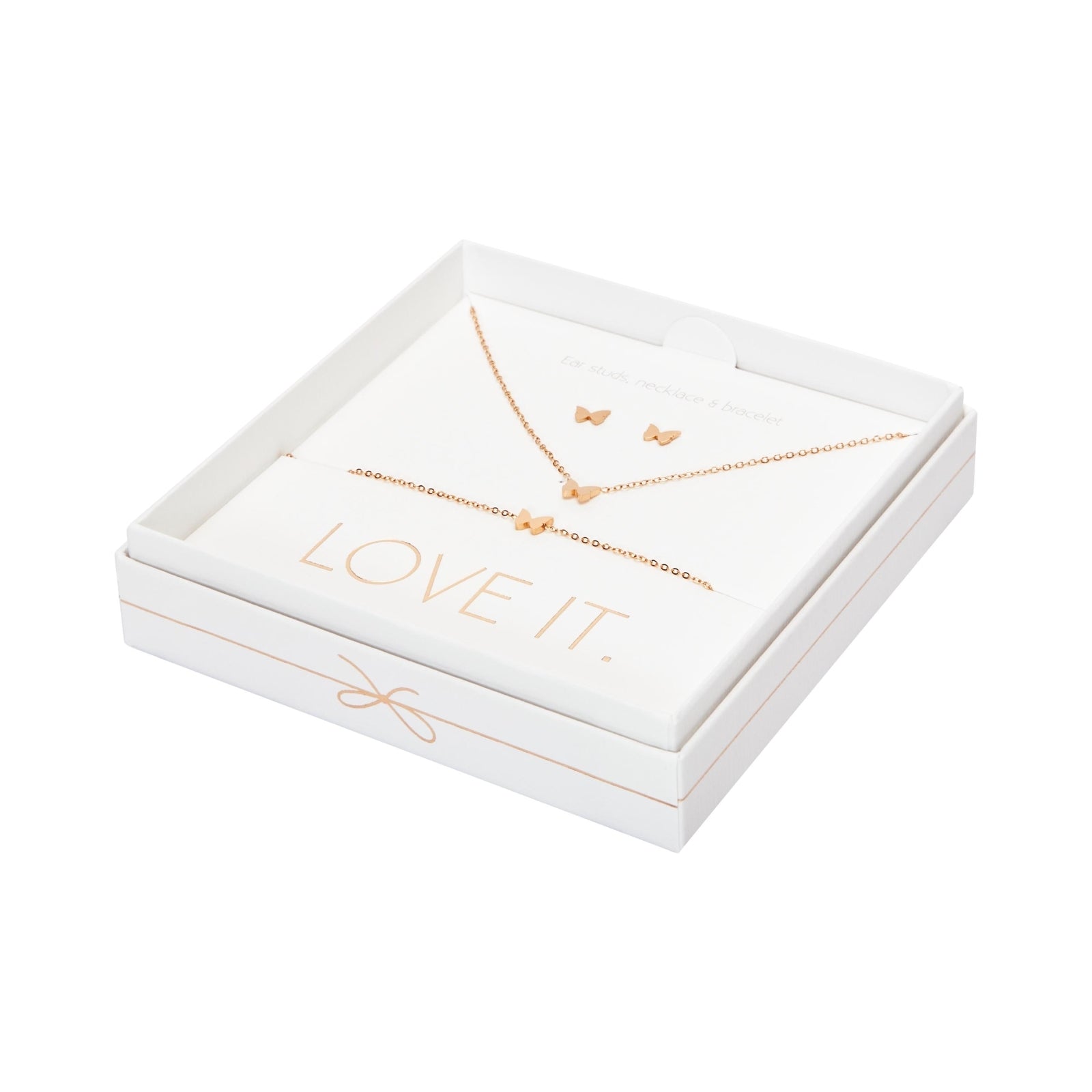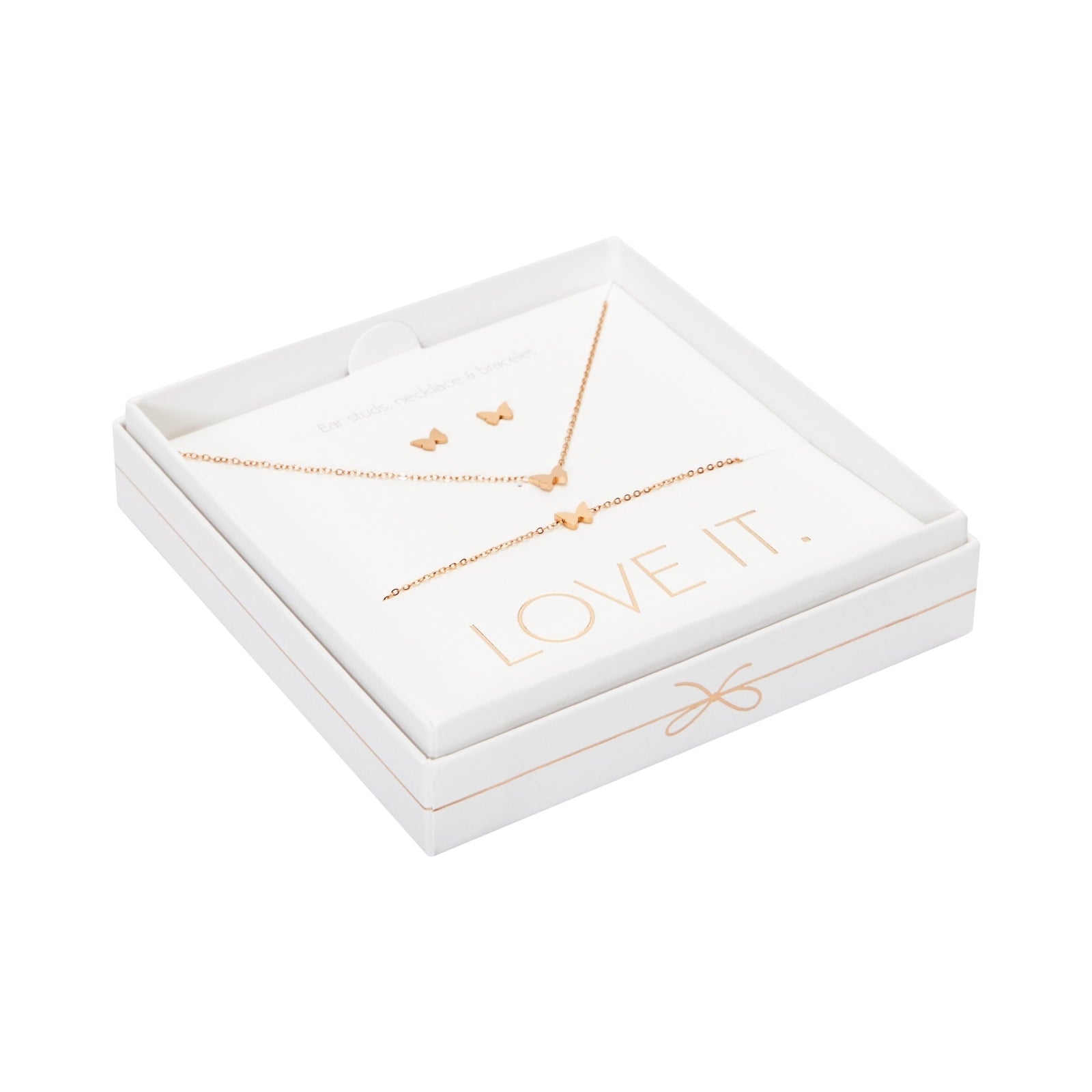 Een hoogwaardige geschenkset uit de Love it. collectie bestaande uit een armband, ketting en oorstekers. Prachtig verpakt in een elegante kartonnen geschenkdoos met venster en glanzende hot foil-stempel.