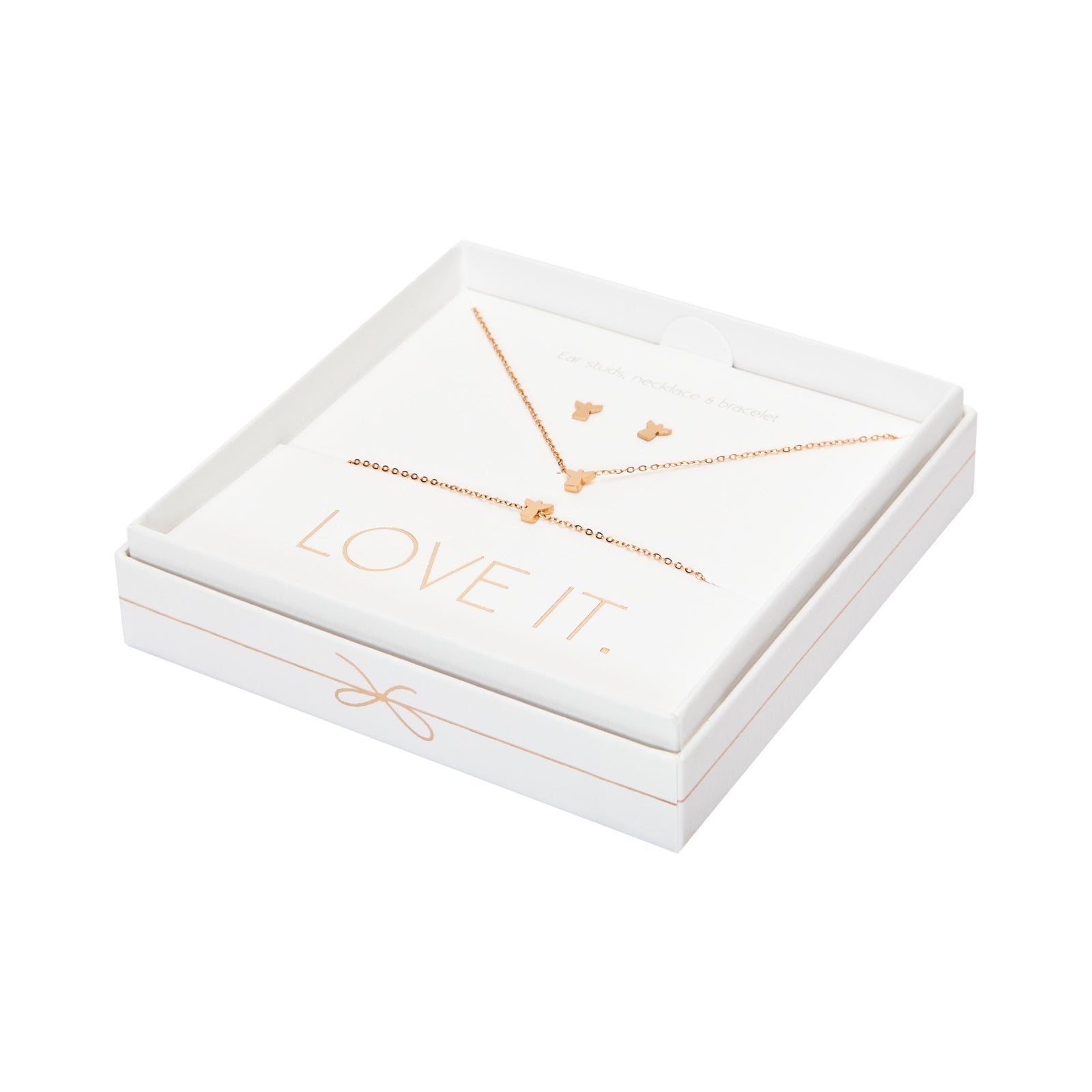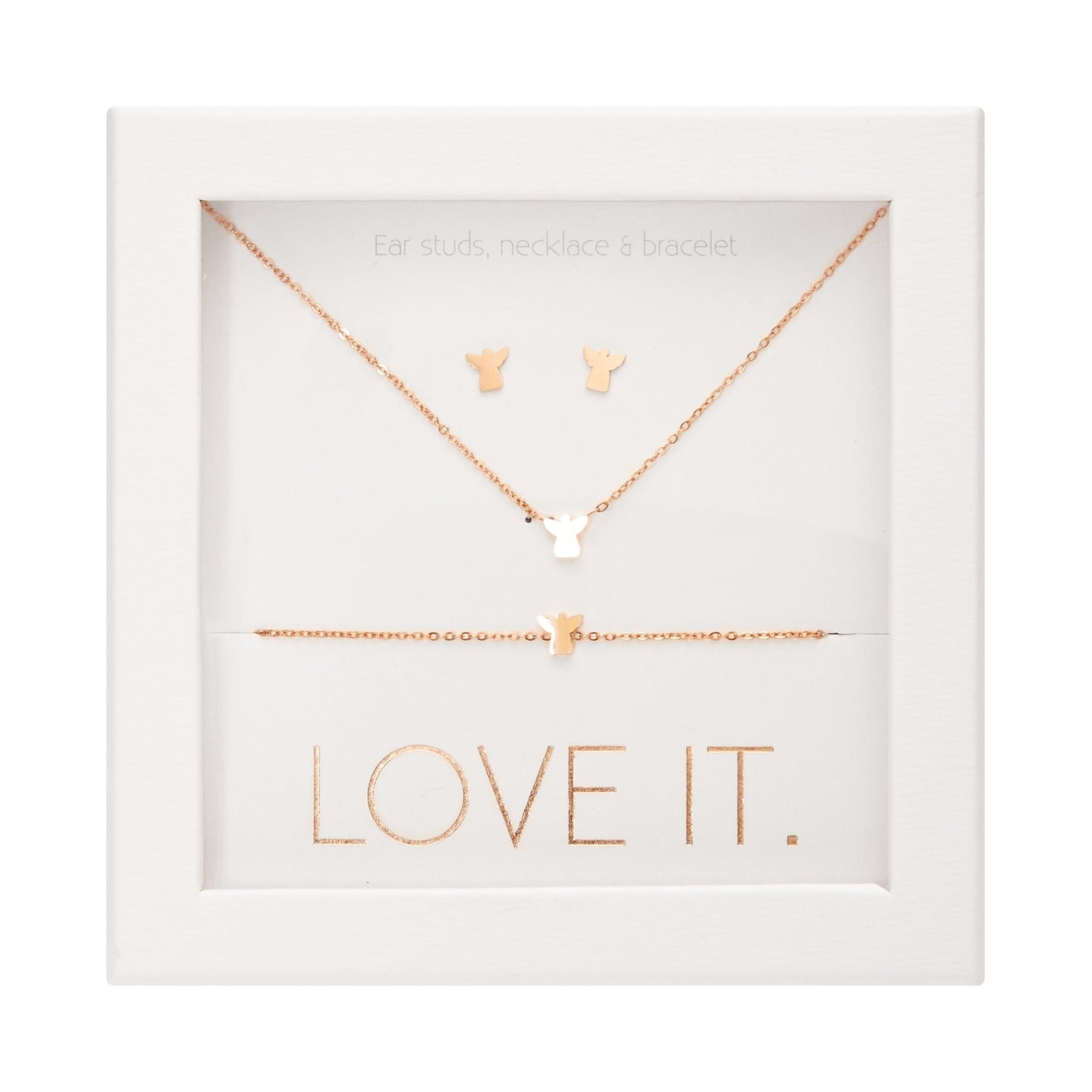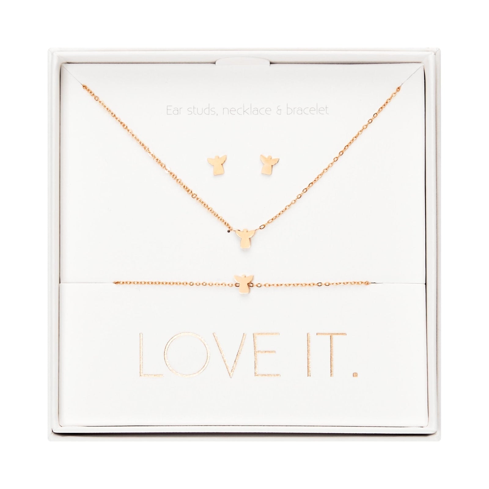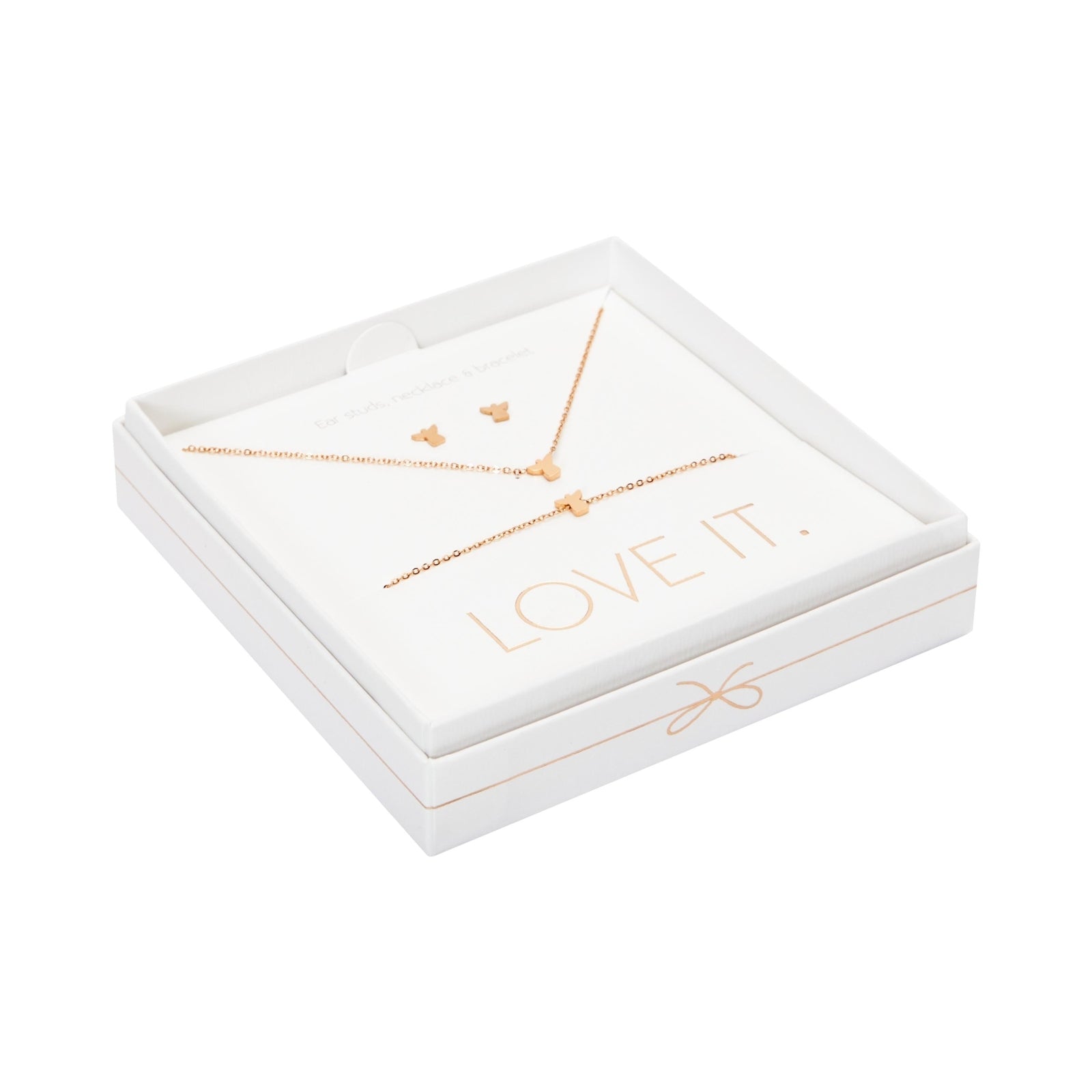 Een hoogwaardige geschenkset uit de Love it. collectie bestaande uit een armband, ketting en oorstekers. Prachtig verpakt in een elegante kartonnen geschenkdoos met venster en glanzende hot foil-stempel.