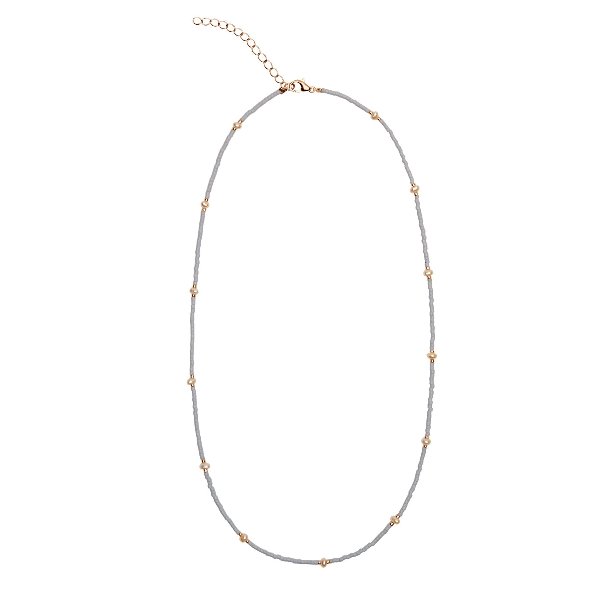 Prachtige ketting gemaakt van een combinatie van Miyuki en gekweekte zoetwaterparels in de kleur grijs. De ketting heeft een verlengkettinkje van ca. 5 cm en is daardoor variabel in lengte.