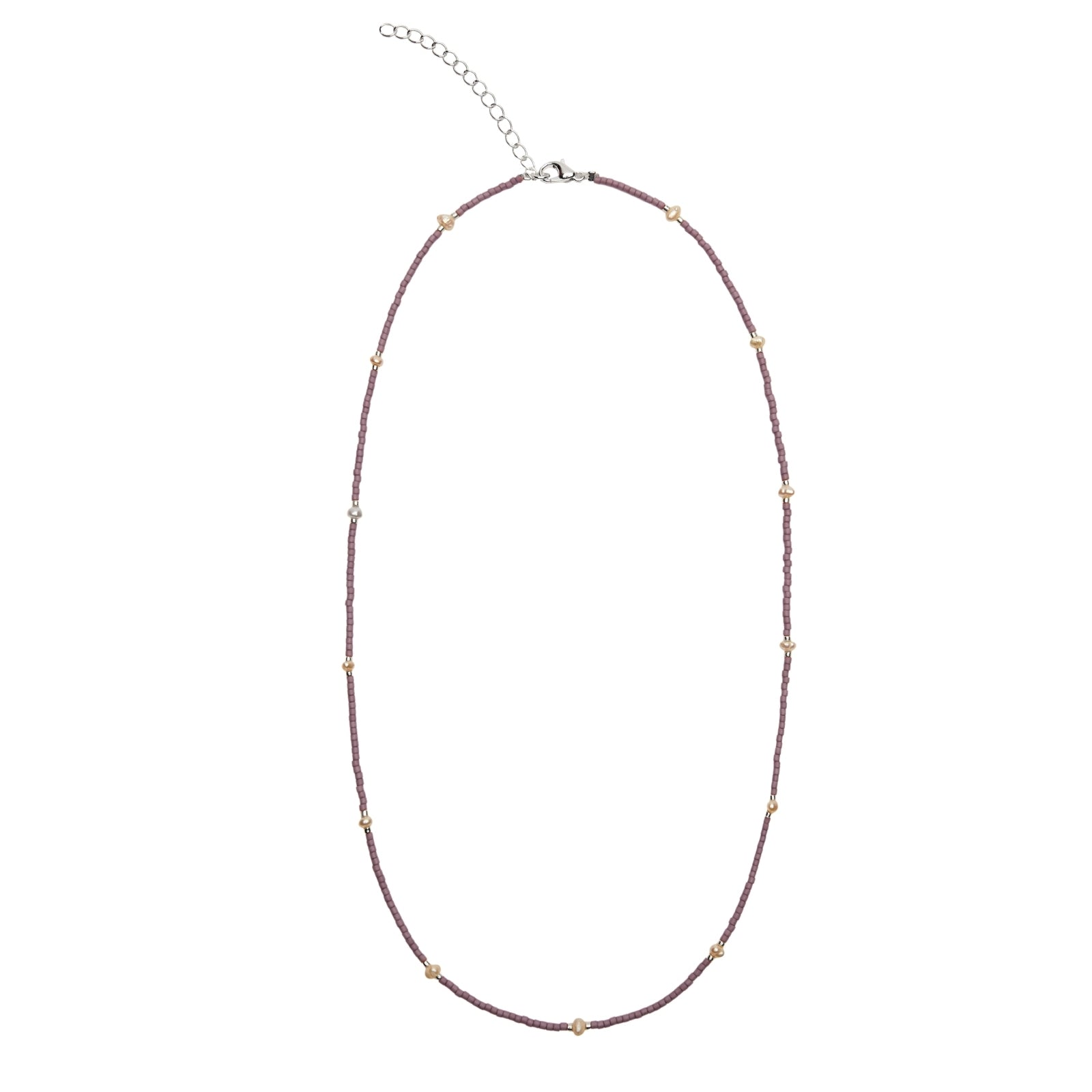 Prachtige ketting gemaakt van een combinatie van Miyuki en gekweekte zoetwaterparels in de kleur roze. De ketting heeft een verlengkettinkje van ca. 5 cm en is daardoor variabel in lengte.