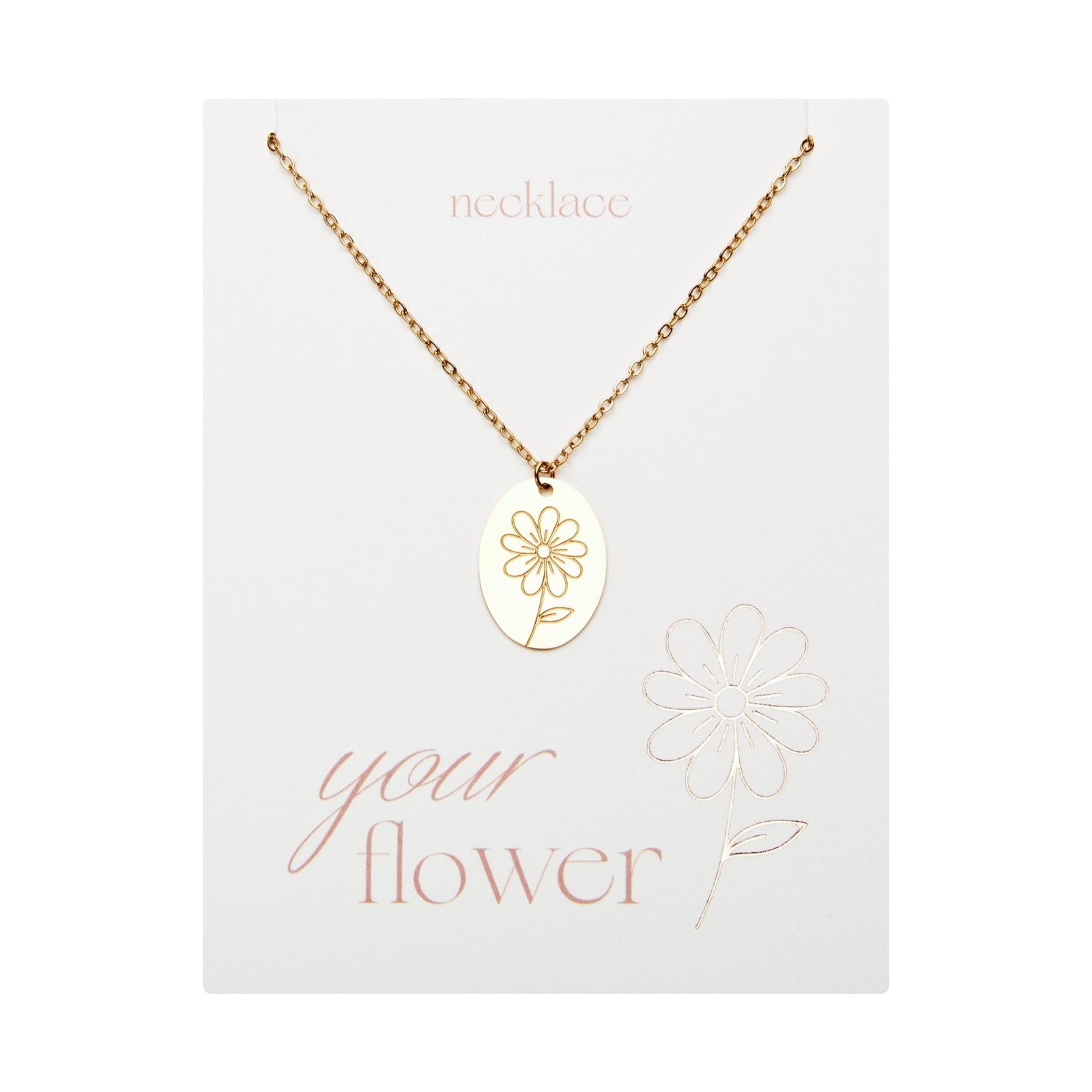 De collectie Your Flower bestaat uit kettingen en armbanden, elk gegraveerd met een geboortebloem. Alle sieraden zijn gemaakt van roestvrij staal en 6 geboortebloemen zijn ook verguld. Op de achterkant van elke ketting staat de naam van de bloem in het Engels gegraveerd. Er zijn armbanden die bij de kettingen passen.
