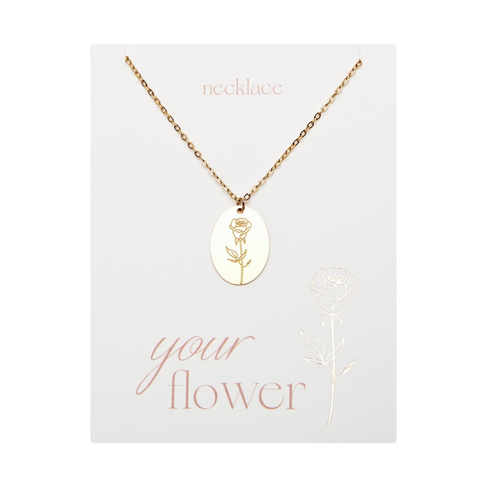De collectie Your Flower bestaat uit kettingen en armbanden, elk gegraveerd met een geboortebloem. Alle sieraden zijn gemaakt van roestvrij staal en 6 geboortebloemen zijn ook verguld. Op de achterkant van elke ketting staat de naam van de bloem in het Engels gegraveerd. Er zijn armbanden die bij de kettingen passen.