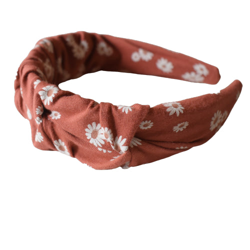 Handgemaakte hoofdband van geribd katoen met margrietmotief.
