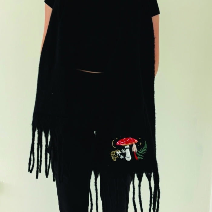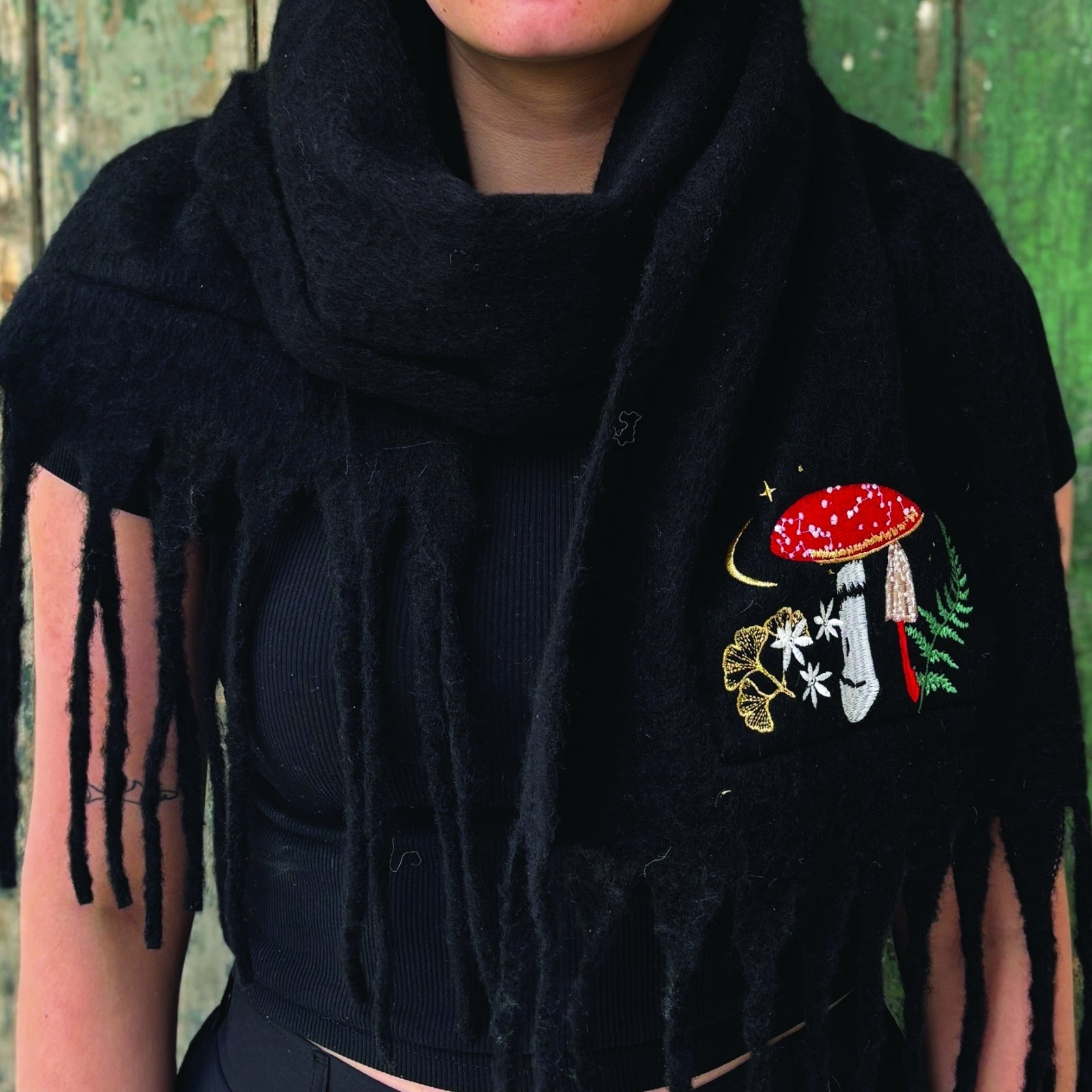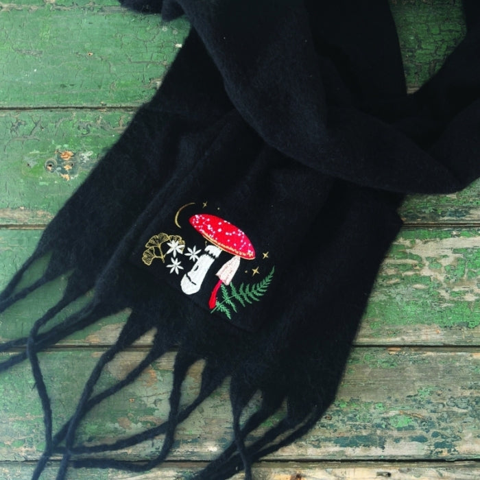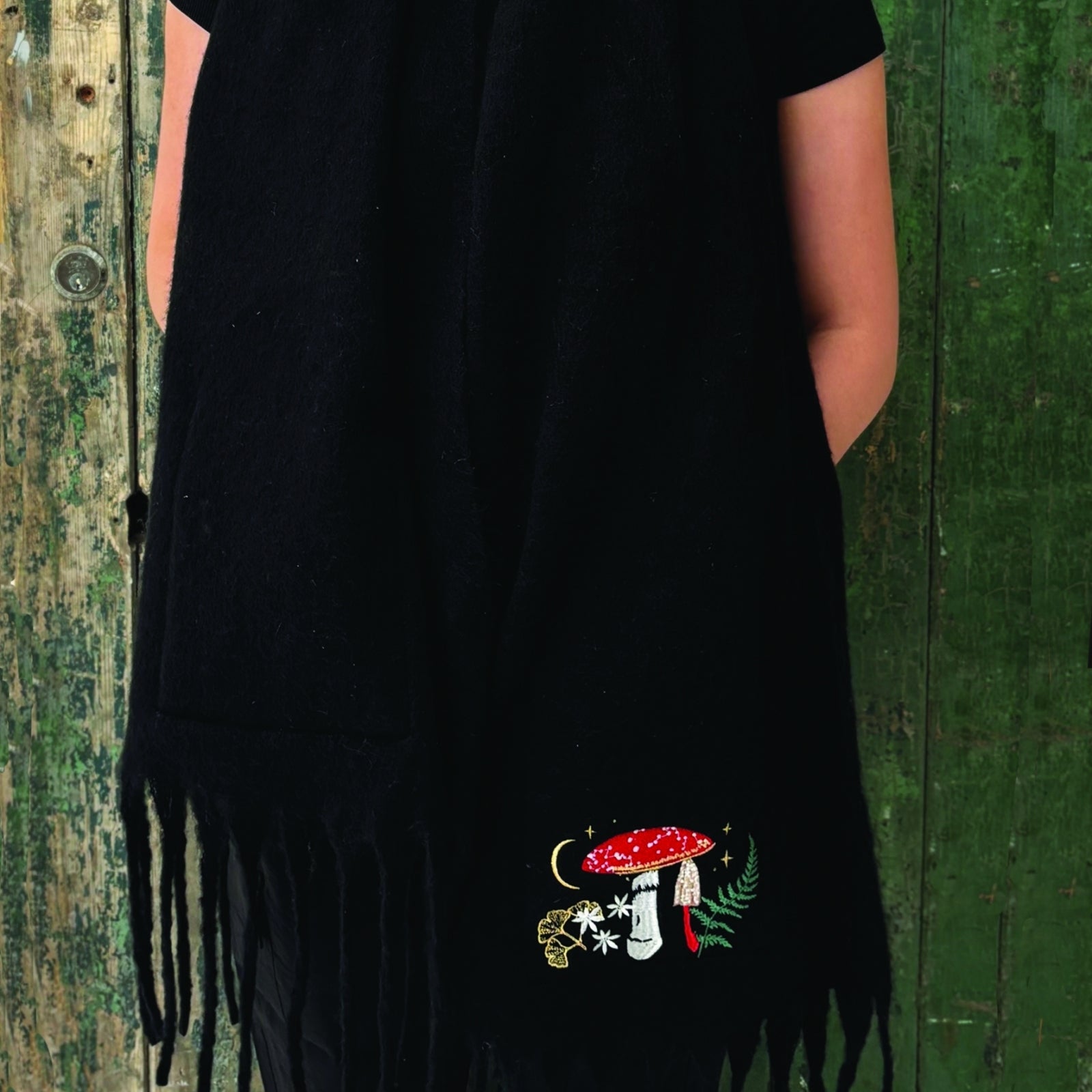 Kenmerken: Voeg een vleugje boscharmonie toe aan je accessoires met deze mooie geborduurde sjaal. Onder de maan en sterren onthult deze prachtige sjaal een geborduurd tafereel van de bosgrond. Op een bed van zwarte gebreide stof speelt de scène zich 's nachts af en komt tot leven met paddenstoelen en varens. Sla deze mooie sjaal om je schouders en voel de magie van het bos de hele dag lang! Een mooi cadeau voor natuurliefhebbers.