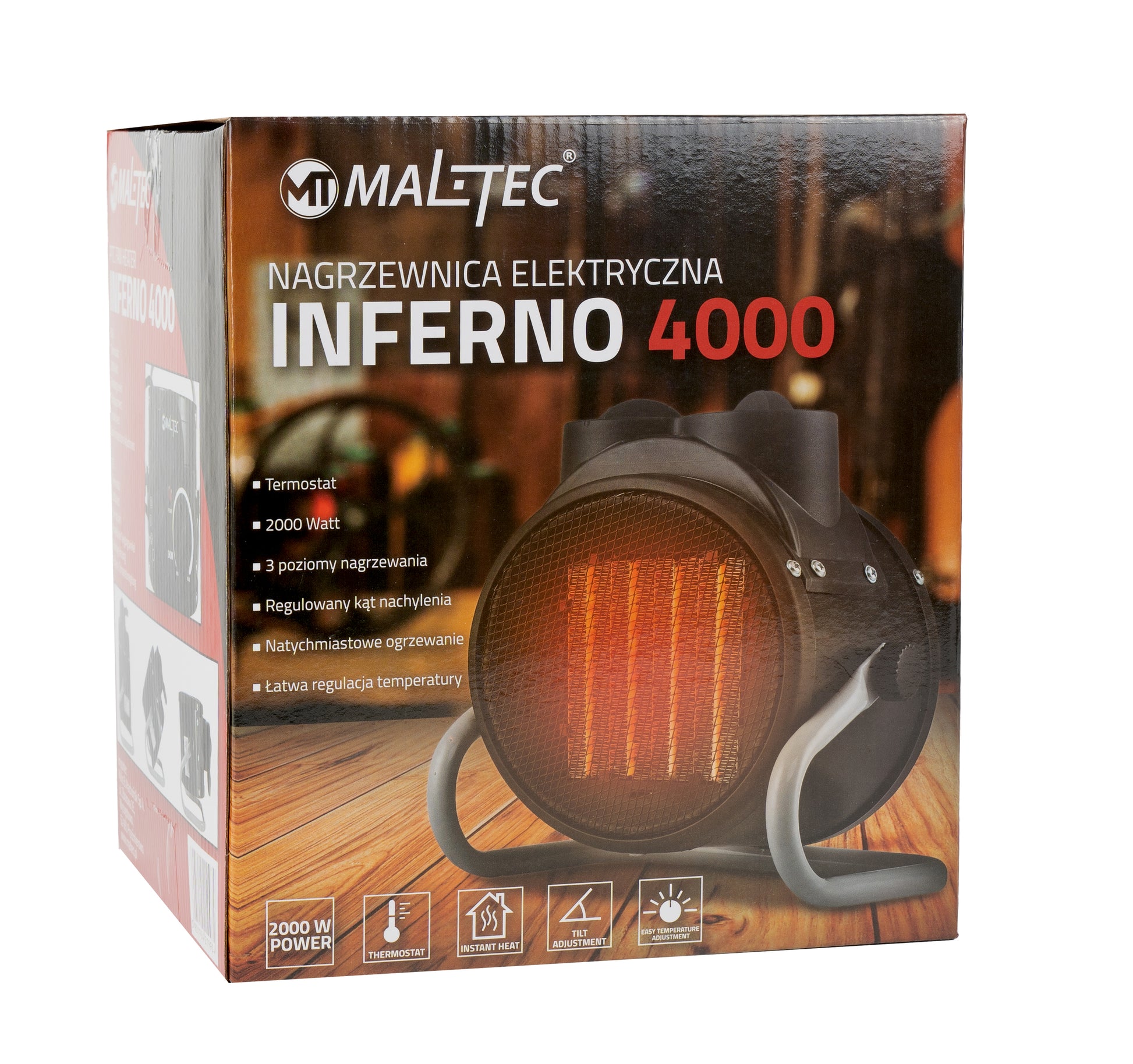 De INFERNO4000 elektrische verwarming heeft een hoge verwarmingsefficiëntie. In tegenstelling tot traditionele elektrische verwarmingen met ijzeren elementen, is deze verwarming uitgerust met keramische elementen, die effectiever zijn in het overbrengen van warmte naar de omgeving.