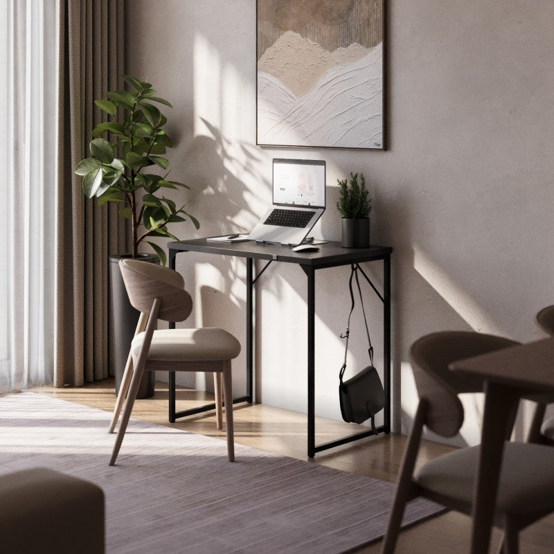 Met zijn minimalistische uitstraling, industriële frame en slimme oplossingen zoals een handige haak voor je tas of hoofdtelefoon, biedt dit bureau alles voor comfortabel werken op een klein oppervlak.