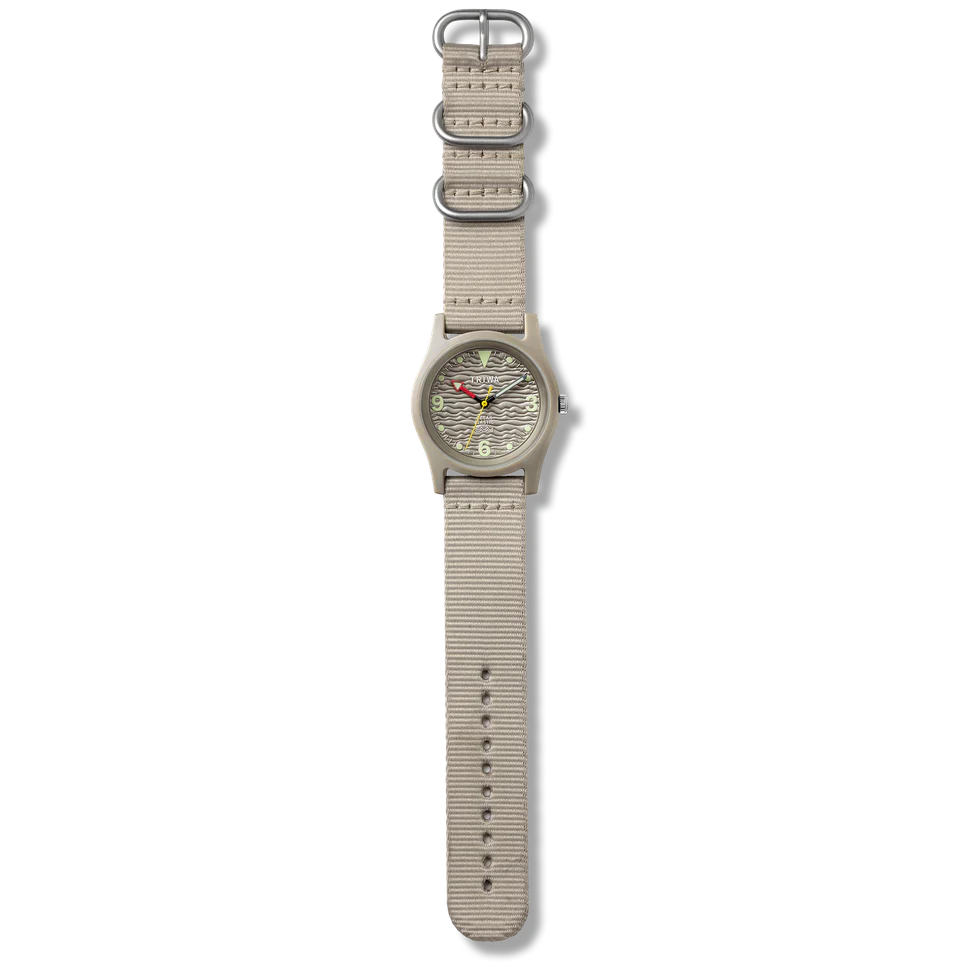 Met dit beige milieuvriendelijke horloge zie je eruit als iemand die weet wat hij doet, zelfs als je alleen maar koffie gaat drinken. De gepolijste 3D-golf wijzerplaat doet denken aan de diepten van de oceaan, terwijl het duurzame ontwerp en de 10 ATM waterdichtheid het ideaal maken voor het leven in de stad of aan zee. Het opvallende, beige silhouet past naadloos bij zowel formele kleding als casual looks.
