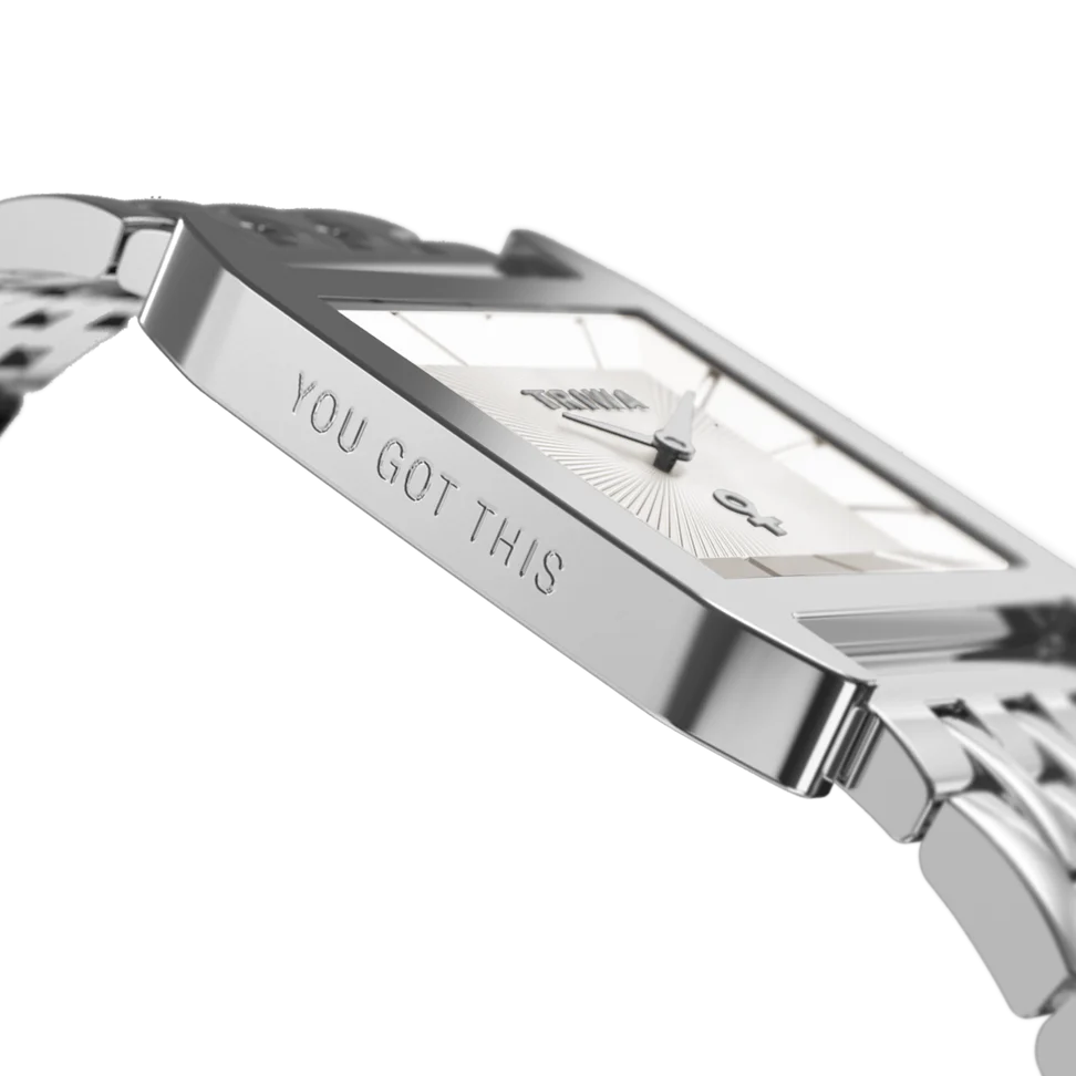 Time for Power Silver is niet zomaar een horloge, het is een gedurfd, alledaags eerbetoon aan de onstuitbare kracht van vrouwen. Klassiek ontmoet modern in een gedurfde nieuwe vorm. Met een gestroomlijnd rechthoekig silhouet, een stralende sunray wijzerplaat en empowerende details zoals de ingegraveerde "YOU GOT THIS" mantra en het iconische vrouwelijke symbool, is het een draagbare herinnering om ruimte in te nemen en je eigen stem te laten horen. Dit roestvrijstalen horloge, gemaakt door vrouwen voor vrouwen, verandert stille elegantie in een krachtig statement. En het heeft precies de juiste hoeveelheid pit. Power dressing? Dit is kracht tikken.