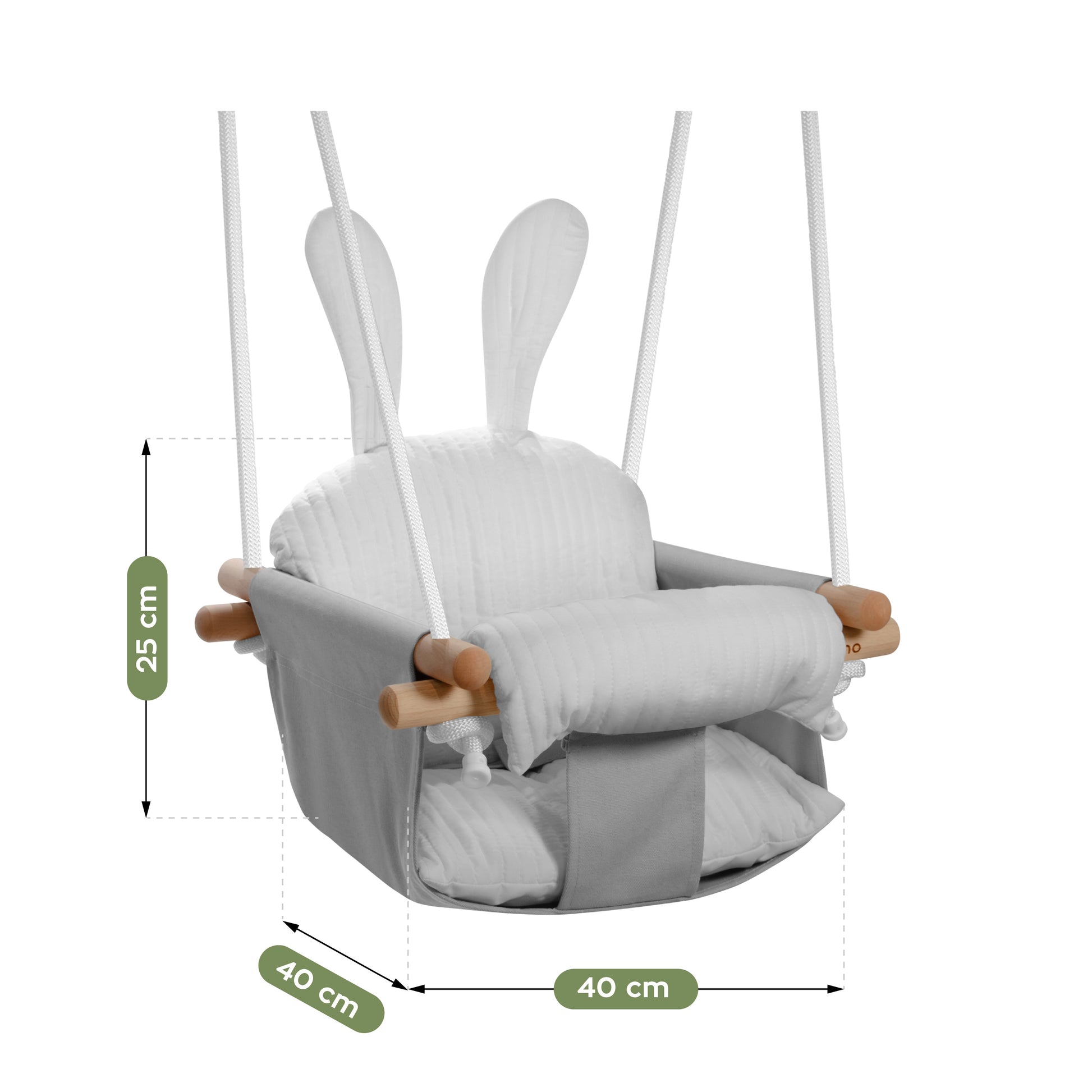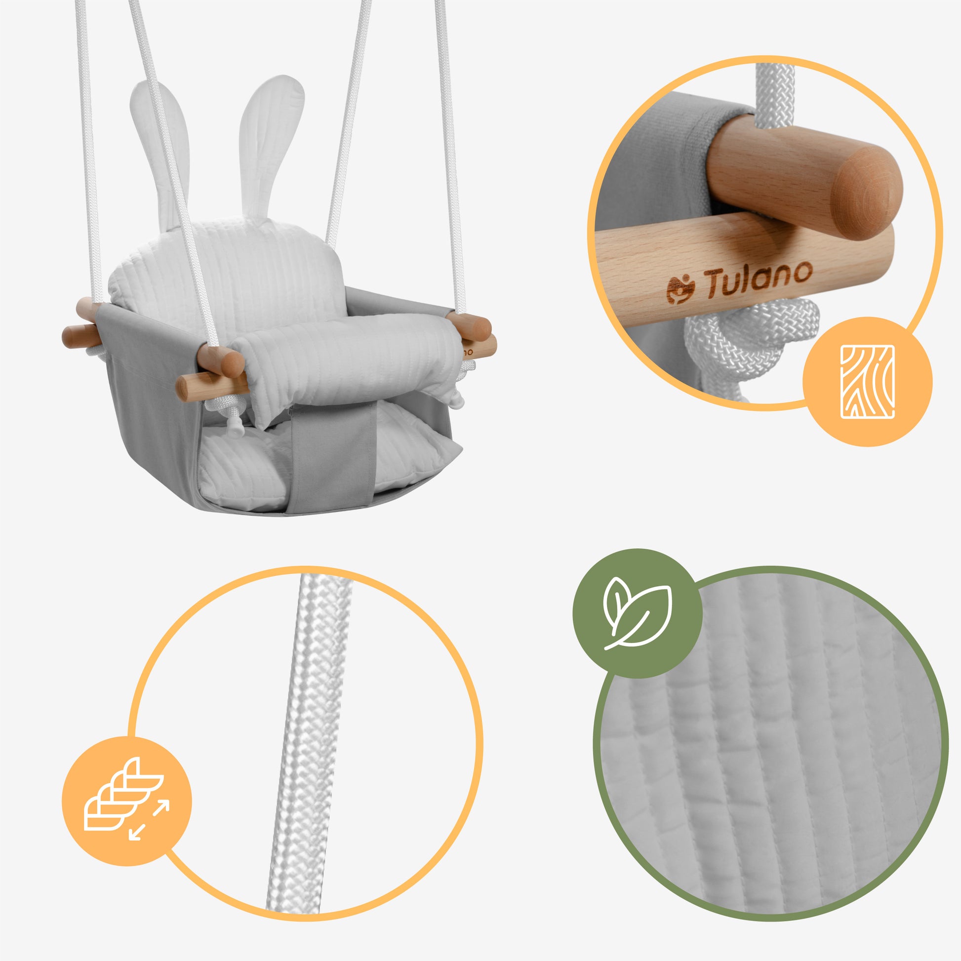Om de tere huid van uw kind te beschermen, hebben we voor de Hop 33-schommels natuurlijke materialen gebruikt. Het zacht aanvoelende katoenen doek zorgt voor een goede luchtdoorlatendheid. De constructie van beukenhout garandeert een esthetisch design.
